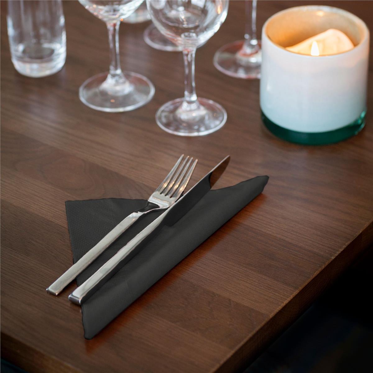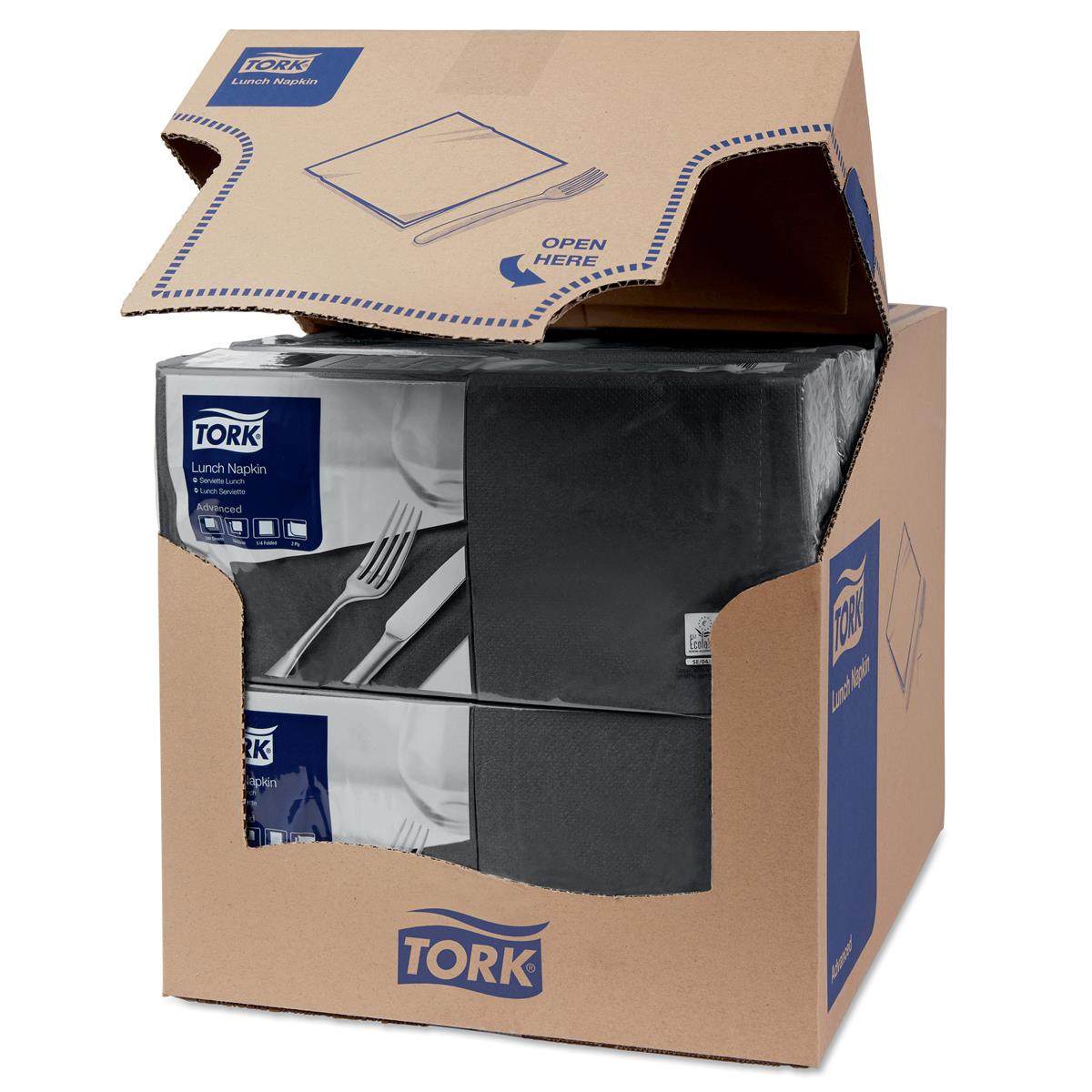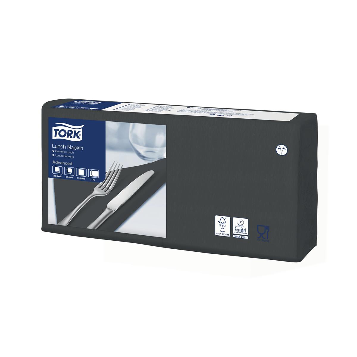 Serwetki lunchowe Czarne Advanced Tork doskonale sprawdzają się do śniadań i obiadów. Charakteryzują się jasnym kolorem, miękkością i wysoką chłonnością – posiadają 2 warstwy. Wymiary serwetki lunchowej Tork przed złożeniem wynoszą 33 x 33 cm, dzięki czemu serwetka zachowuje swoje duże rozmiary nawet podczas składania (w ¼). Już jedno opakowanie serwetek lunchowych to aż 200 sztuk – w całym kartonie natomiast mieści się 2000 sztuk. Certyfikacja FSC gwarantuje, że produkt pochodzi z lasów zarządzanych w sposób odpowiedzialny i zapewniają korzyści dla środowiska, społeczeństwa oraz gospodarki. Produkt spełnia rygorystyczne standardy środowiskowe EU Ecolabel. Nowe pudełko z ergonomicznym rozwiązaniem Tork Easy Handling® optymalizuje codzienną pracę poprzez ułatwione przenoszenie, otwieranie i utylizację opakowań. Dodatkowo każda binda jest także zapakowana w folię – wyższy poziom higieny i Twojej wygody. Produkt dopuszczony do kontaktu z żywnością. Posiada kilka klasycznych wersji kolorystycznych, dzięki czemu jest możliwość doboru wyglądu serwetki do serwowanego dania. Możliwość spersonalizowania nadruku.