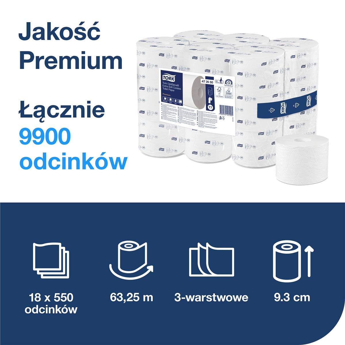 Tork 472650 OptiServe® – najwyższy standard komfortu i wydajności w segmencie premium System Tork OptiServe® to zaawansowane rozwiązanie stworzone dla obiektów, które stawiają na najwyższą jakość, elegancję oraz niezawodność. W porównaniu do tradycyjnych rolek papieru i systemów jumbo oferuje nie tylko większą wydajność, ale także zdecydowanie wyższy komfort użytkowania – idealny wybór dla hoteli, biur klasy premium i ekskluzywnych przestrzeni publicznych. Ten wariant papieru toaletowego został zaprojektowany z myślą o najbardziej wymagających użytkownikach, łącząc luksusowe odczucia z efektywnością operacyjną. Papier toaletowy pasujący do dozowników w systemie T7 w jakości Premium to idealny wybór na miejsc, gdzie liczy idealna prezentacja i komfort użytkownika. 3-warstwowy, miękki i luksusowy papier – wyjątkowy komfort i delikatność, podnoszące standard każdej łazienki Tork OptiServe® w wersji premium to połączenie luksusu, funkcjonalności i nowoczesnych rozwiązań – wybór dla tych, którzy chcą zapewnić swoim gościom najwyższy poziom komfortu i dbałości o detale.