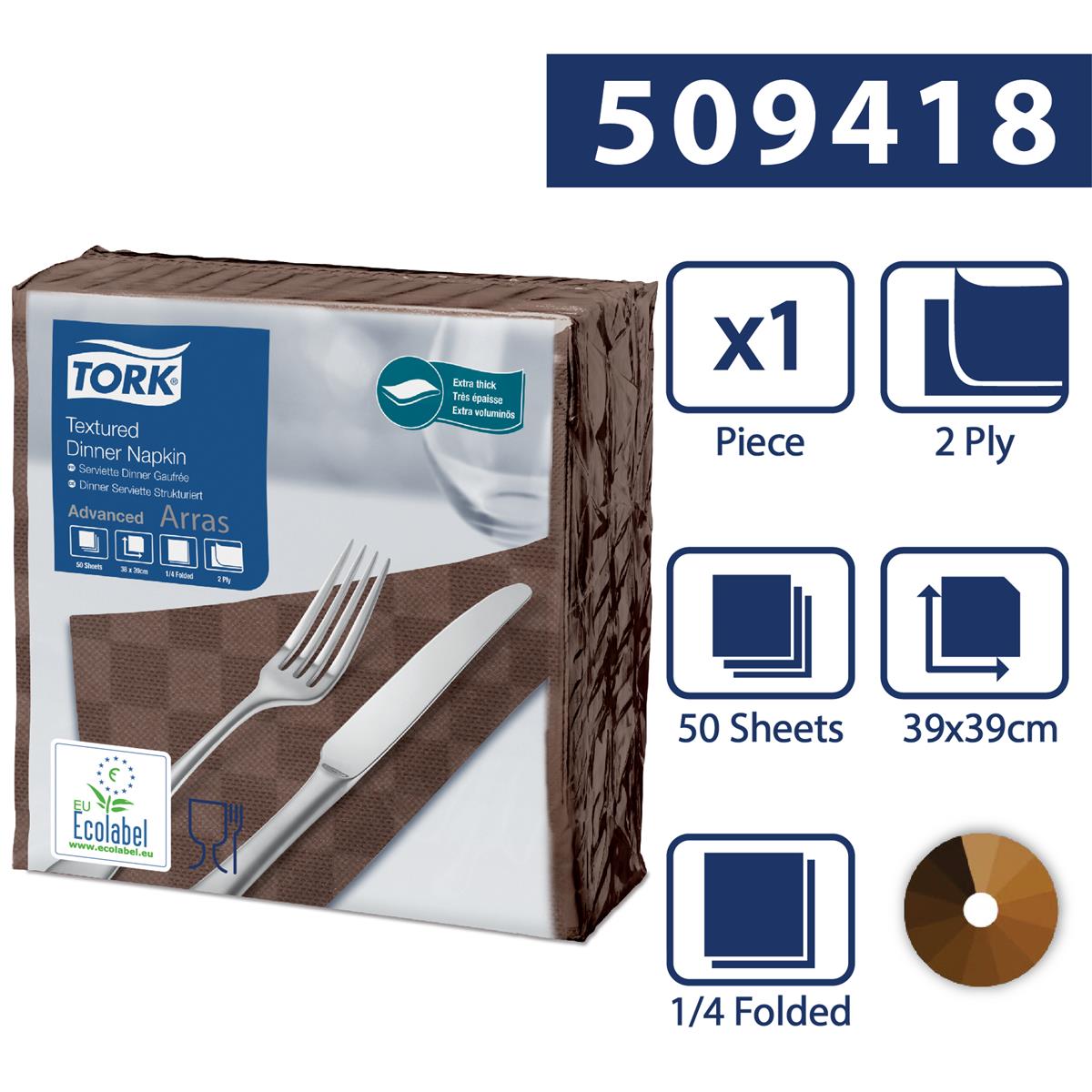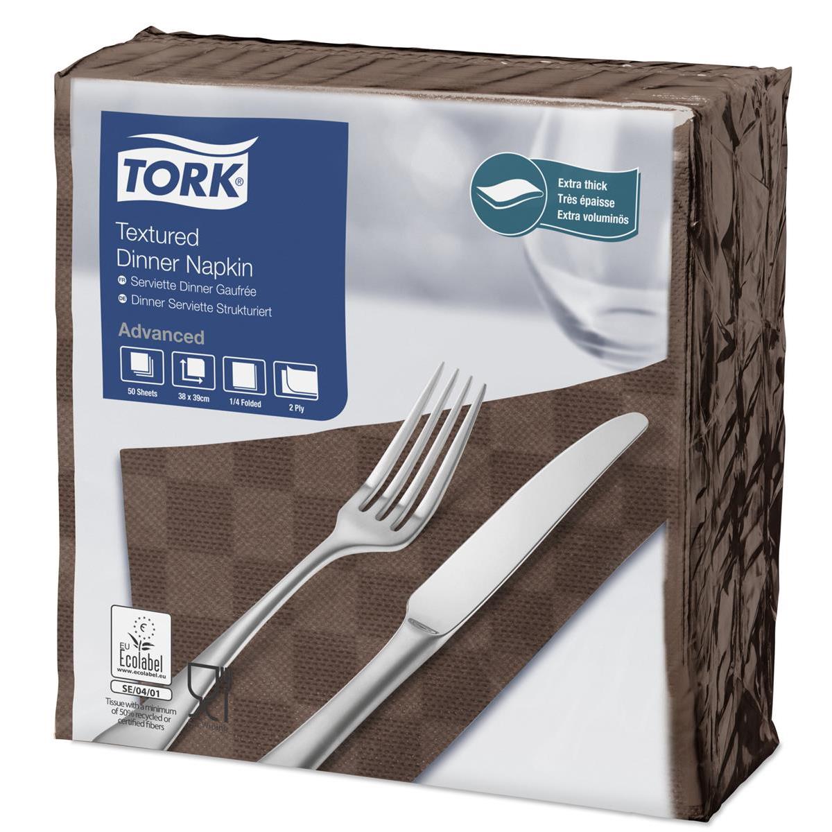 Serwetki Obiadowe Textured Brązowe Advanced Tork idealnie sprawdzą się podczas obiadów i kolacji. Serwetki Textured charakteryzuje niezwykła chłonność i miękkość, co zawdzięczają swojej grubości. Estetyczne i oryginalne tłoczenie na całej powierzchni serwetek wykonane na wzór szachownicy przyciąga uwagę. Wymiary serwetek przed złożeniem to 39 x 38 cm (serwetki obiadowe należą do największych w ofercie Tork), dzięki czemu nawet po złożeniu (w ¼) zachowują duży rozmiar, aby wystarczyć na cały posiłek. W jednym opakowaniu znajduje się 50 sztuk serwetek, natomiast w całym kartonie 900 sztuk. Certyfikacja FSC gwarantuje, że produkt pochodzi z lasów zarządzanych w sposób odpowiedzialny i zapewniają korzyści dla środowiska, społeczeństwa oraz gospodarki. Produkt spełnia rygorystyczne standardy środowiskowe EU Ecolabel. Ergonomiczne rozwiązanie Tork Easy Handling® optymalizuje codzienną pracę poprzez ułatwione przenoszenie, otwieranie i utylizację opakowań. Produkt dopuszczony do kontaktu z żywnością. Serwetki obiadowe posiadają szeroką gamę klasycznych i nowoczesnych kolorów.